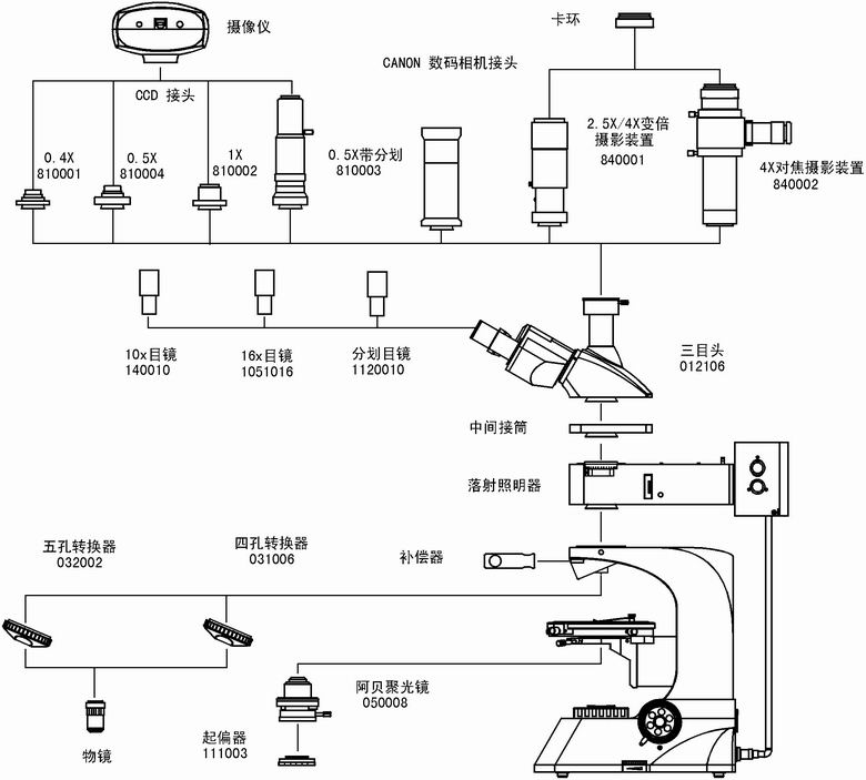 目镜:大视野WF10X分化目镜10X无应力平场消色差物镜:5X 10X40X (弹)60X(弹)