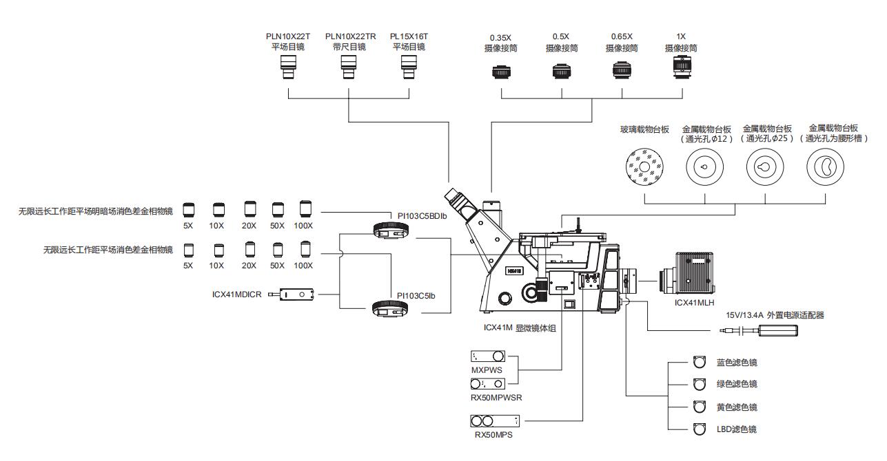 其他 | 起偏镜插板,固定式检偏镜插板,360°旋转式检偏镜插板 ; DIC 微分干涉组件 ;滤色片组 ;高精度测微尺 |