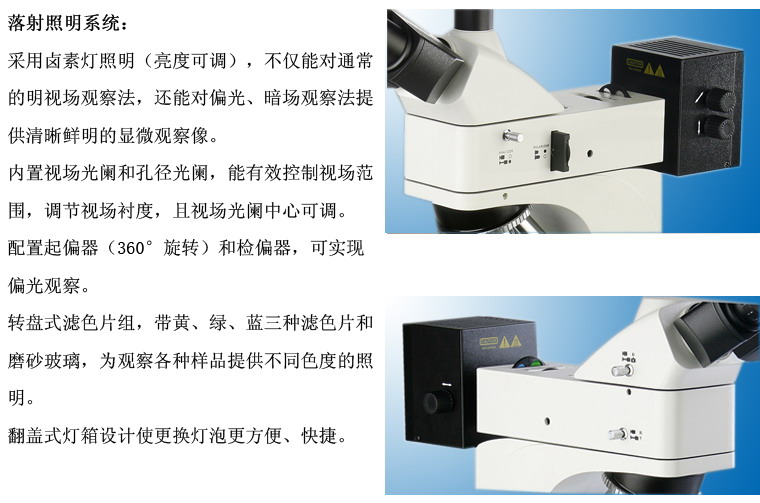 落射照明系统 | 6V30W卤素灯,亮度可调 | |