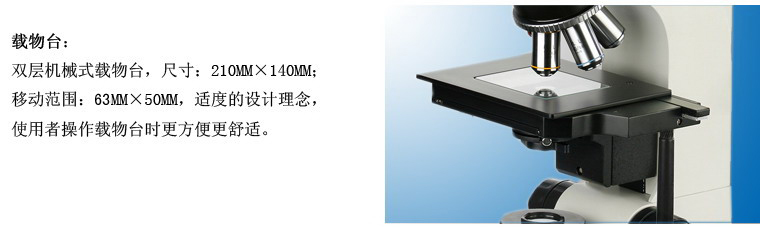 载物台 | 双层机械移动式载物台, 外形尺寸:210mmX140mm,移动范围:63mmX50mm | |