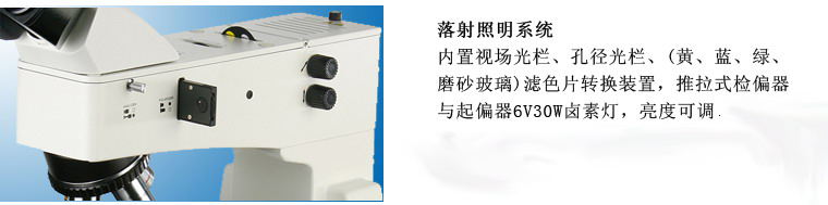 目镜筒三目镜30˚倾斜, 可100%通光摄影 | 6V30W卤素灯,亮度可调内置视场光栏、孔径光栏、(黄、蓝、绿、磨砂玻璃)滤色片转换装置,推拉式检偏器与起偏器 |