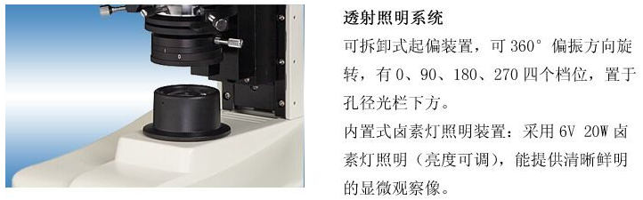 光源卤素灯,亮度可调 | 起偏器可360°旋转,有0、90、180、270四个读数 | 卤素灯照明适用 | 6V 20W | ||