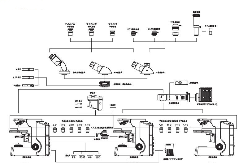 中间镜组 | 配推拉式检偏组,可移出光路;内置勃氏镜,转盘式切换机构(中心、焦距可调) |