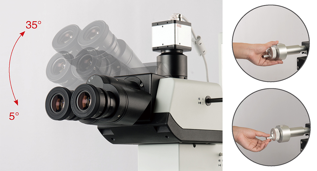 30°倾斜,倒像,无限远铰链三通观察筒,瞳距调节 :50-76mm,两档分光比 :100/0 或 50/50
